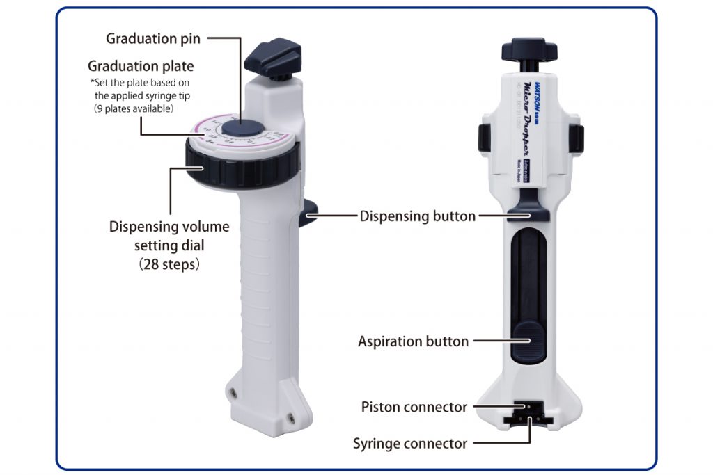 Micropipette / Dispenser Repetitive Pipette “Micro Dropper” Applicable for the convective dispensing. Positive-displacement principle The piston of the syringe tip touches the sample directly.Aspirating without air prevent contamination being into the body itself, resulting in accuracy suctioning and dispensing. 9 grades for each syringe Each syringe can be set to 28 different dispensing volumes, allowing up to 100 continuous dispensing actions with a single filling. 9 syring tips cover a range of dispensing volumes from 1 µL to 14mL.* 1 µL dispensing : Using 0.1 mL syringe 14mL dispensing : Using 50 mL syringe Body : Autoclavable(Graduation Plate : Not Autoclavable) Micro Dropper Technical data DL Contents ・Micro Dropper(Body)・Graduation Plate(0.1 mL~50 mL, 9 plates)・Instruction Manual Cat. No.ItemPackagingMD-01Repetitive Pipette “Micro Dropper”1 unit / boxDesign and specifications are subject to change without notice for improvement. Syringe Tips for Micro Dropper Cat. No.ItemAspiration Volumemax.Dispensing Volumemax.Dispensing Volumemin.Packaging1654-0010.1 mL, Syringe Tips for Micro Dropper100 µL28 µL1 µL50 pieces / bag1654-001S0.1 mL, Syringe Tips for Micro Dropper100 µL28 µL1 µL50 pieces(Individual packaging)1654-0020.2 mL, Syringe Tips for Micro Dropper200 µL56 µL2 µL50 pieces / bag1654-002S0.2 mL, Syringe Tips for Micro Dropper200 µL56 µL2 µL50 pieces(Individual packaging)1654-0050.5 mL, Syringe Tips for Micro Dropper500 µL140 µL5 µL50 pieces / bag1654-005S0.5 mL, Syringe Tips for Micro Dropper500 µL140 µL5 µL50 pieces(Individual packaging)1654-0101 mL, Syringe Tips for Micro Dropper1 mL280 µL10 µL50 pieces / bag1654-010S1 mL, Syringe Tips for Micro Dropper1 mL280 µL10 µL50 pieces(Individual packaging)1654-0252.5 mL, Syringe Tips for Micro Dropper2.5 mL700 µL25 µL50 pieces / bag1654-025S2.5 mL, Syringe Tips for Micro Dropper2.5 mL700 µL25 µL50 pieces(Individual packaging)1654-0505 mL, Syringe Tips for Micro Dropper5 mL1.4 mL50 µL50 pieces / bag1654-050S5 mL, Syringe Tips for Micro Dropper5 mL1.4 mL50 µL50 pieces(Individual packaging)1654-10010 mL, Syringe Tips for Micro Dropper10 mL2.8 mL100 µL50 pieces / bag1654-100S10 mL, Syringe Tips for Micro Dropper10 mL2.8 mL100 µL50 pieces(Individual packaging)1654-25025 mL, Syringe Tips for Micro Dropper25 mL7 mL250 µL50 pieces / bag1654-250S25 mL, Syringe Tips for Micro Dropper25 mL7 mL250 µL50 pieces(Individual packaging)1654-50050 mL, Syringe Tips for Micro Dropper50 mL14 mL500 µL25 pieces / bag1654-500S50 mL, Syringe Tips for Micro Dropper50 mL14 mL500 µL25 pieces(Individual packaging)Design and specifications are subject to change without notice for improvement. Product Inquiry ※We also accept inquiries for mass production development of custom shapes, such as OEM and ODM, for plastic products. Contact