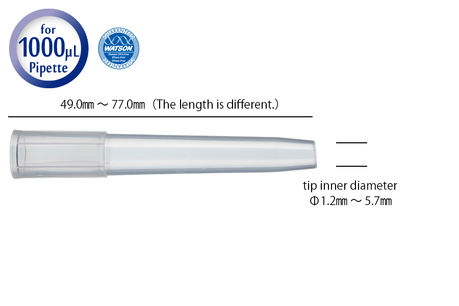 Pipette Tips Large-bore Tips Due to its wide tip opening, it is suitable for pipetting tasks involving cells and other samples, Tips, Plates: made of Polypropylene Filter: made of Polyethylene Cat. No.ItemUnitCase113-744CLarge-bore Pipette Tips for 200 µL, Bulk1000 tips10 bags120P-744CSLarge-bore Pipette Tips for 200 µL, System Rack (PP)96 tips X 10 racks5 units124P-744CSLarge-bore Filter Tips for 200 µL, System Rack (PP)96 tips X 10 racks5 units1298-703RAEmpty Rack for #703 / #50310 racks5 units Tips, Plates: made of Polypropylene Filter: made of Polyethylene Cat. No.ItemUnitCase113-844CLarge-bore Pipette Tips for 1000 µL, Bulk1000 tips10 bags120P-844CSLarge-bore Pipette Tips for 1000 µL, System Rack (PP)96 tips X 10 racks5 units124P-844CSLarge-bore Filter Tips for 1000 µL, System Rack (PP)96 tips X 10 racks5 units1298-802RAEmpty Rack for #502/ #706/ #80410 racks5 units Edgeless Large-bore Tips The tip comes with various inside diameters.Select one that fits the size of the sample. Note: Since the diameter and length of the tip vary from tip to tip in a bulk supply, the actual volume may not be exactly as stable as 1000uL.Therefore, please DO NOT set the aspiration volume of the pipette as 1000uL but set it much smaller than 1000uL to avoid any accidental over-suction of the sample resulting in contamination inside the pipette. Tips: made of Polypropylene Cat. No.ItemUnitCase113-842CEdgeless Large-bore Pipette Tips for 1000 µL, Bulk1000 tips-1298-802RAEmpty Rack for #502/ #706/ #80410 racks5 units Product Inquiry ※We also accept inquiries for mass production development of custom shapes, such as OEM and ODM, for plastic products. Contact